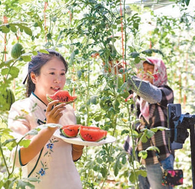 山東省濱州市濱城區(qū)一家生態(tài)園的西瓜大棚內(nèi),主播正在直播帶貨。新華社記者 郭緒雷攝