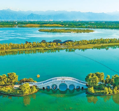 陜西省西咸新區(qū)灃東新城昆明池,青山綠水相映成趣。查朝陽攝(影像中國)