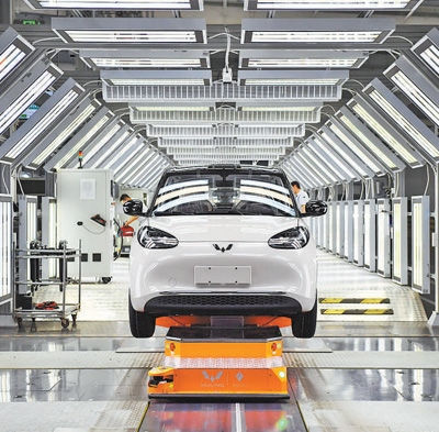 廣西壯族自治區(qū)柳州市上汽通用五菱精益智造工廠內(nèi),整車正等待下線。新華社記者 金皓原攝