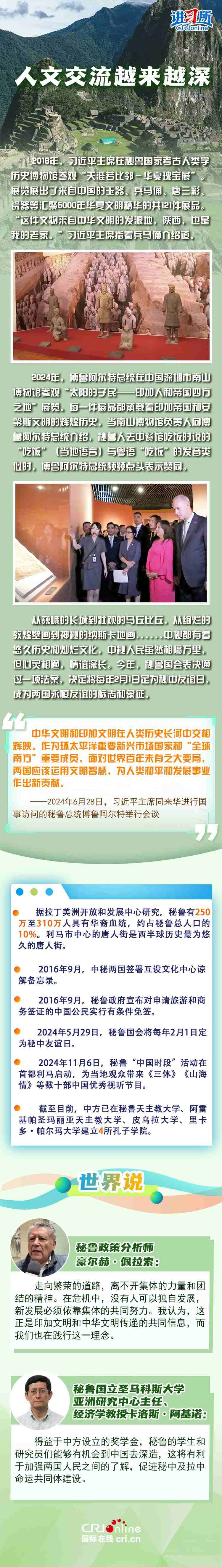 時(shí)隔八年,習(xí)近平主席的秘魯之行即將開啟,兩國元首半年內(nèi)實(shí)現(xiàn)互訪,體現(xiàn)出雙方高水平的政治互信。中秘這對(duì)跨洋“友鄰”也必將在元首外交的戰(zhàn)略引領(lǐng)下,抒寫更多民相親、心相通的動(dòng)人故事。