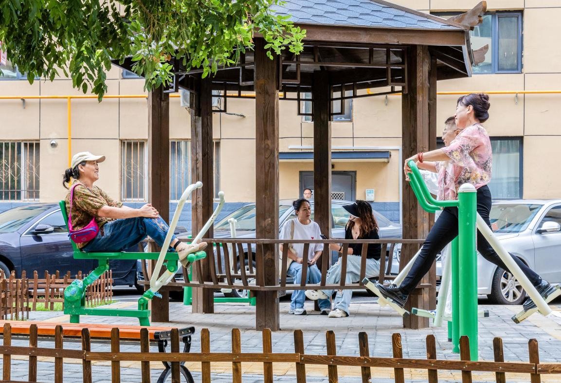 2024年8月26日,內(nèi)蒙古呼和浩特市玉泉區(qū)綠緣小區(qū),居民在改造后的運動休閑區(qū)健身。