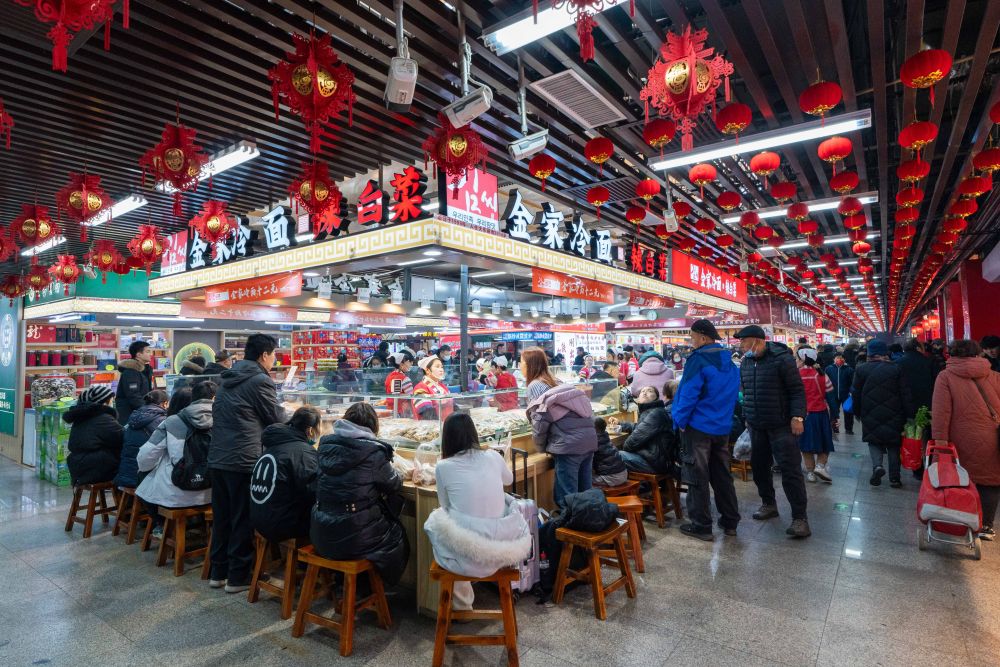 2025年1月22日,游客在沈陽中街長安寺胡同小吃街游玩。