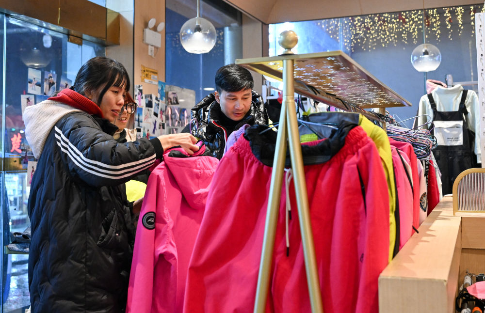 2025年1月23日,游客在湖北神農(nóng)架林區(qū)木魚鎮(zhèn)街邊一家店鋪挑選雪具雪服。自然天成的地理環(huán)境造就豐富的冰雪資源,也給當(dāng)?shù)剡\(yùn)動裝備銷售、租賃行業(yè)帶來了商機(jī)。