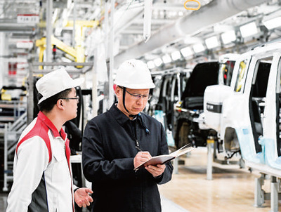 全國人大代表、重慶紅江機械有限責任公司加工中心特級技師傅國濤(右)在汽車智能化生產車間進行調研。