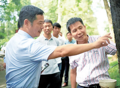 全國政協(xié)委員、中國科學院院士黃三文(左一)在海南省儋州市調研橡膠產業(yè)科技創(chuàng)新情況。