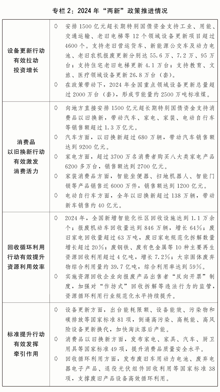 四是加力擴圍實施“兩新”政策。安排超長期特別國債5000億元支持大規(guī)模設(shè)備更新和消費品以舊換新,統(tǒng)籌投資、財政、金融等綜合性政策,深入推進設(shè)備更新、消費品以舊換新、回收循環(huán)利用、標(biāo)準(zhǔn)提升四大行動。進一步加大重點領(lǐng)域設(shè)備更新項目支持力度,加力實施設(shè)備更新貸款貼息,加快存量設(shè)備評估診斷和項目儲備。進一步支持消費品以舊換新,擴大汽車報廢更新支持范圍,完善汽車置換更新補貼標(biāo)準(zhǔn),實施手機、平板等數(shù)碼產(chǎn)品購新補貼,積極支持家裝消費品換新,簡化補貼申領(lǐng)和支付流程,完善資金監(jiān)管機制,嚴(yán)厲打擊價格欺詐和違規(guī)騙補套補行為。