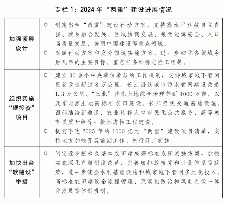 二是發(fā)行超長期特別國債支持“兩重”建設(shè)取得積極進展。著眼于系統(tǒng)解決強國建設(shè)、民族復(fù)興進程中一些重大項目建設(shè)的資金問題,從2024年起發(fā)行超長期特別國債支持國家重大戰(zhàn)略和重點領(lǐng)域安全能力建設(shè)。堅持自上而下、軟硬結(jié)合,建立實施項目儲備、集中聯(lián)審、??顚S谩娀O(jiān)督等全鏈條推進保障機制?!坝餐顿Y”方面,嚴(yán)格做好項目篩選,2024年安排7000億元超長期特別國債支持1465個重大項目建設(shè),項目基本全部開工、全年完成投資超過1.2萬億元?!败浗ㄔO(shè)”方面,堅持項目建設(shè)和配套改革相結(jié)合,扎實推進規(guī)劃編制、政策制定和體制機制改革創(chuàng)新,不斷完善投入機制、提高投入效率。規(guī)范項目全過程管理方面,出臺“兩重”建設(shè)有關(guān)管理辦法,督促項目加快開工建設(shè),嚴(yán)格資金監(jiān)管,加強監(jiān)測調(diào)度和現(xiàn)場監(jiān)督檢查,確保建成優(yōu)質(zhì)工程、精品工程、放心工程。