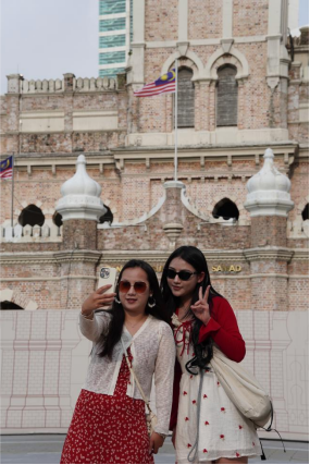 兩名來自中國云南的游客在馬來西亞首都吉隆坡地標(biāo)性歷史建筑蘇丹阿卜杜勒·薩馬德大廈前合影。人民日報(bào)記者 俞懿春攝