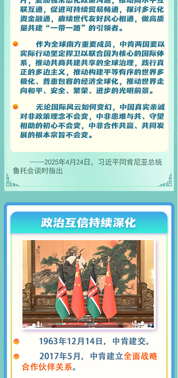 中肯友誼源于古老的海上絲綢之路。新時代以來中肯兩國高層交往密切,政治互信持續(xù)深化??夏醽喐鹘缯J(rèn)為,肯中合作秉持共同愿景,非洲國家應(yīng)充分發(fā)揮非中合作潛力,攜手建設(shè)更加公平公正、多元繁榮的世界。