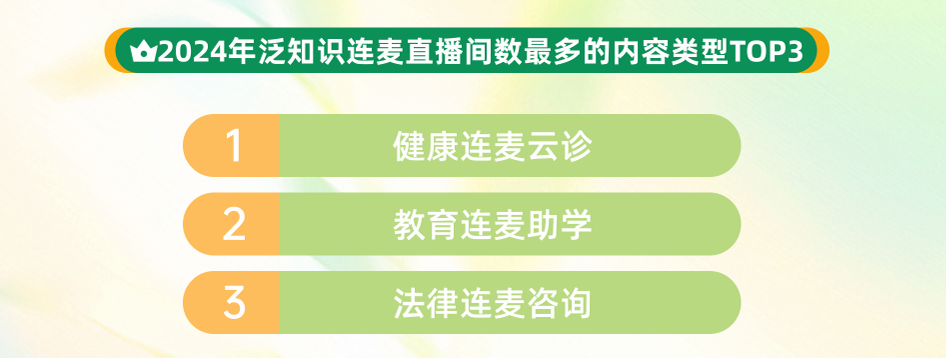 隨著用戶(hù)互動(dòng)與創(chuàng)作者投稿形成正向循環(huán),推動(dòng)生態(tài)雙向繁榮,連麥學(xué)習(xí)正重塑知識(shí)普惠的全新范式。數(shù)據(jù)顯示,2024年,快手泛知識(shí)連麥直播場(chǎng)次達(dá)491萬(wàn)場(chǎng),直播間互動(dòng)量同比提升23%,健康咨詢(xún)、教育助學(xué)、法律咨詢(xún)位列連麥內(nèi)容前三?! ?/p>