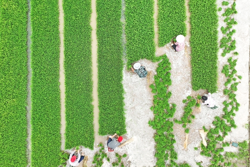 6月11日,在浙江省臺州市仙居縣雙廟鄉(xiāng),農(nóng)民在田間起運(yùn)秧苗(無人機(jī)照片)。