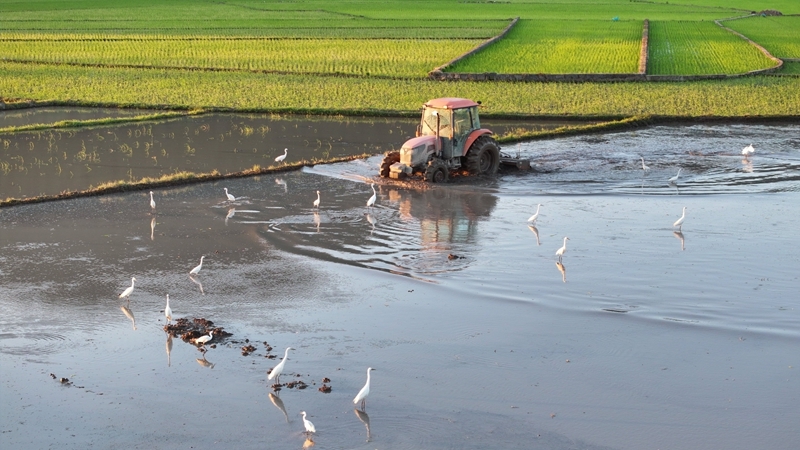 6月10日,在云南省騰沖市和順古鎮(zhèn),農(nóng)民駕駛農(nóng)機(jī)翻耕農(nóng)田準(zhǔn)備栽插水稻秧苗,引來成群的白鷺覓食、嬉戲(無人機(jī)照片)。