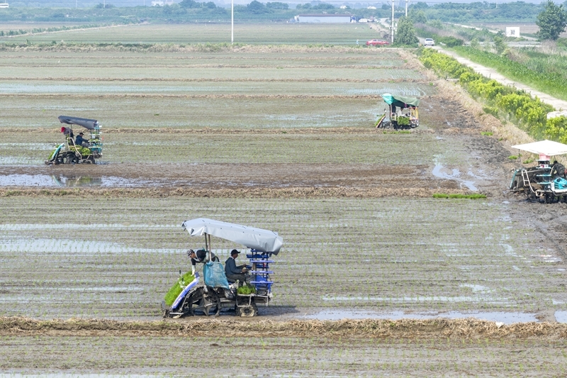 6月12日,在浙江省余姚市濱?,F(xiàn)代農(nóng)業(yè)先導(dǎo)區(qū),農(nóng)機(jī)手駕駛插秧機(jī)進(jìn)行制種水稻插秧(無人機(jī)照片)。