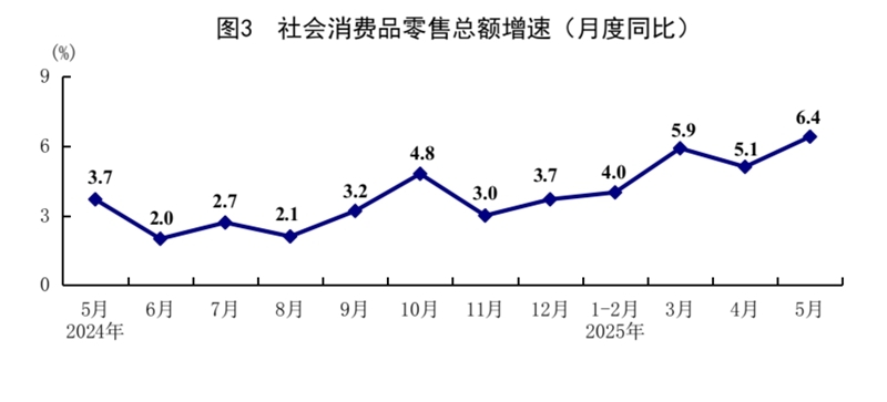 5月份,社會(huì)消費(fèi)品零售總額41326億元,同比增長(zhǎng)6.4%,比上月加快1.3個(gè)百分點(diǎn);環(huán)比增長(zhǎng)0.93%。按經(jīng)營(yíng)單位所在地分,城鎮(zhèn)消費(fèi)品零售額36057億元,同比增長(zhǎng)6.5%;鄉(xiāng)村消費(fèi)品零售額5269億元,增長(zhǎng)5.4%。按消費(fèi)類型分,商品零售額36748億元,增長(zhǎng)6.5%;餐飲收入4578億元,增長(zhǎng)5.9%。基本生活類和部分升級(jí)類商品銷售增勢(shì)較好,限額以上單位糧油食品類、金銀珠寶類、體育娛樂(lè)用品類商品零售額分別增長(zhǎng)14.6%、21.8%、28.3%。消費(fèi)品以舊換新政策持續(xù)顯效,限額以上單位家用電器和音像器材類、通訊器材類、文化辦公用品類、家具類商品零售額分別增長(zhǎng)53.0%、33.0%、30.5%、25.6%。1—5月份,社會(huì)消費(fèi)品零售總額203171億元,同比增長(zhǎng)5.0%。全國(guó)網(wǎng)上零售額60402億元,同比增長(zhǎng)8.5%。其中,實(shí)物商品網(wǎng)上零售額49878億元,增長(zhǎng)6.3%,占社會(huì)消費(fèi)品零售總額的比重為24.5%。1—5月份,服務(wù)零售額同比增長(zhǎng)5.2%。