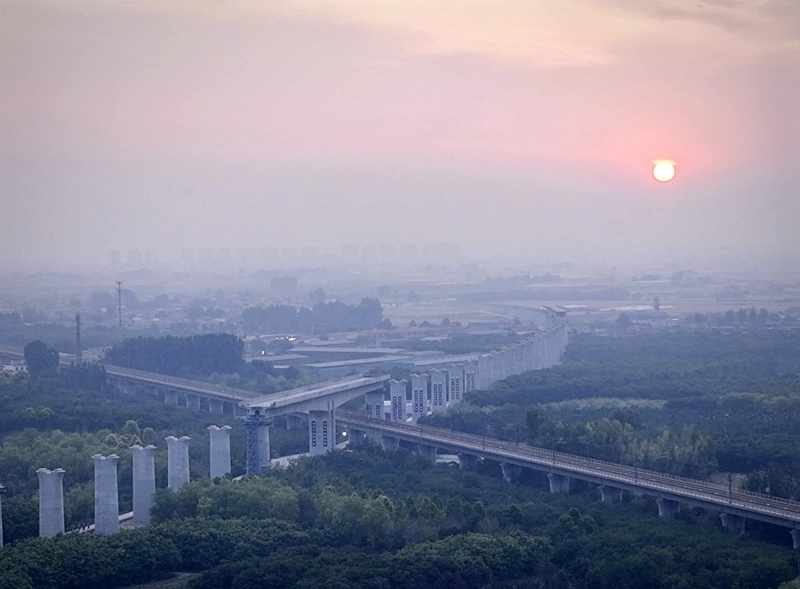 轉體完成的雄忻高鐵雄保段跨京廣高鐵轉體橋(6月18日攝,無人機照片)。