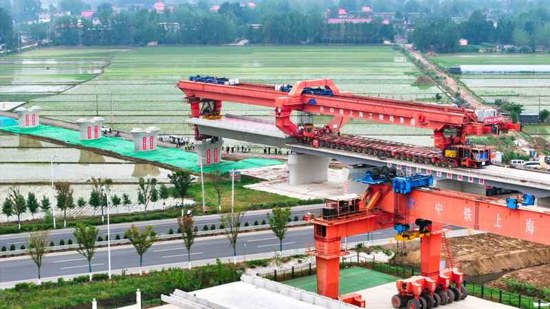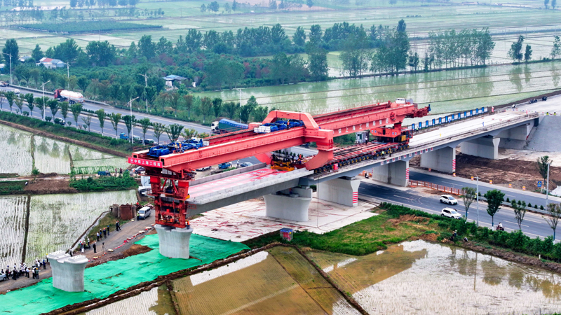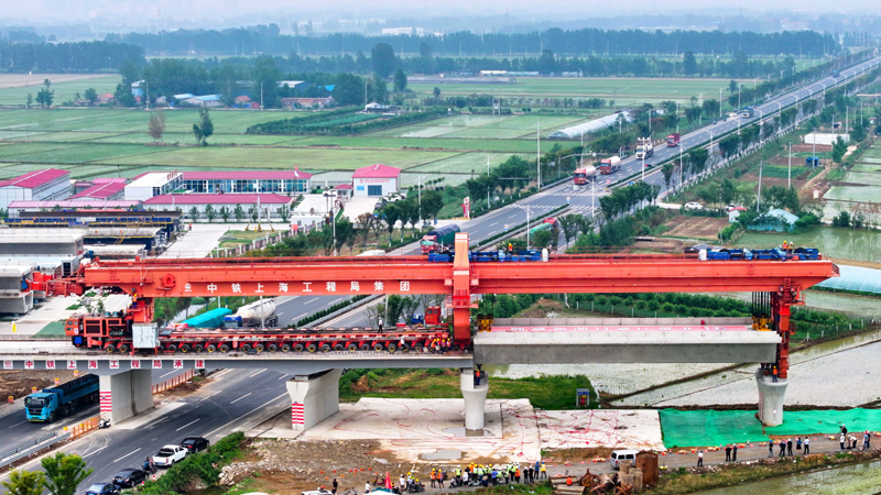 6月21日,在濰宿高鐵郯城沭河特大橋施工現(xiàn)場,中鐵上海局工作人員在進(jìn)行箱梁架設(shè)(無人機照片)。
