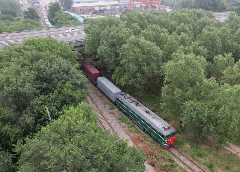 6月30日,北京至阿塞拜疆巴庫的跨里海中歐班列停靠在位于北京市房山區(qū)的北京國際陸港等待發(fā)車(無人機(jī)照片)。