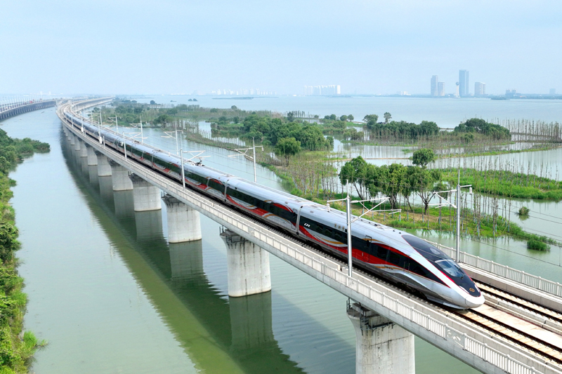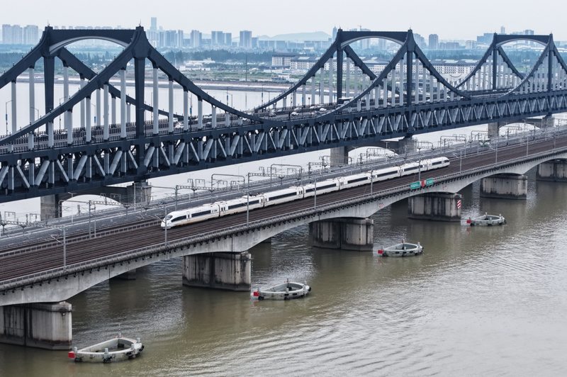 6月30日,一列動車組列車經過武漢天興洲大橋延長線(無人機照片)。