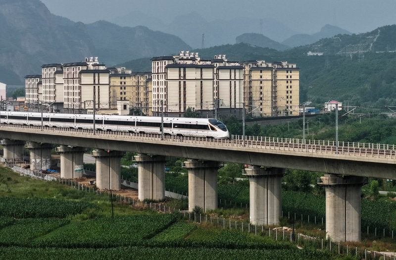 6月30日,一列動車組列車在京哈高鐵承沈段河北省承德市承德縣境內行駛(無人機照片)。