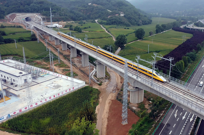 9月11日,聯(lián)調(diào)聯(lián)試綜合檢測(cè)列車(chē)駛過(guò)位于陜西省銅川市的西延高鐵王家河特大橋。