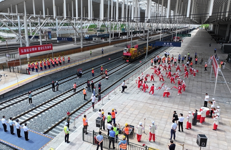7月1日在延安站拍攝的西延高鐵軌道貫通儀式(無(wú)人機(jī)照片)。