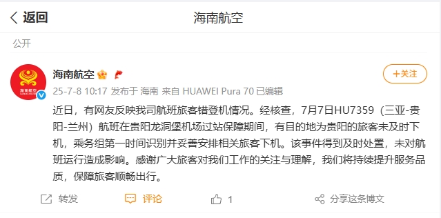 據(jù)海南航空官方微博消息,近日,有網(wǎng)友反映海南航空航班旅客錯(cuò)登機(jī)情況。經(jīng)核查,7月7日HU7359(三亞-貴陽-蘭州)航班在貴陽龍洞堡機(jī)場過站保障期間,有目的地為貴陽的旅客未及時(shí)下機(jī),乘務(wù)組第一時(shí)間識(shí)別并妥善安排相關(guān)旅客下機(jī)。該事件得到及時(shí)處置,未對航班運(yùn)行造成影響。