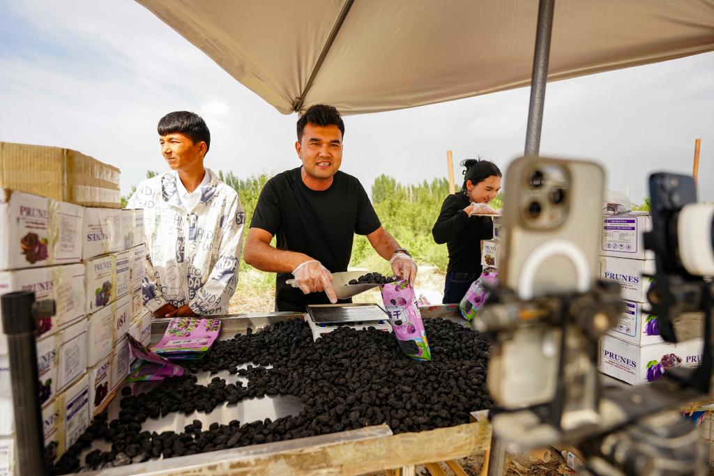2025年6月23日,在新疆阿克蘇市新疆紅旗坡農(nóng)貿(mào)物流園,“95后”電商米爾扎提·卡米力在直播帶貨當?shù)剞r(nóng)產(chǎn)品。新華社記者 徐宏巖 攝
