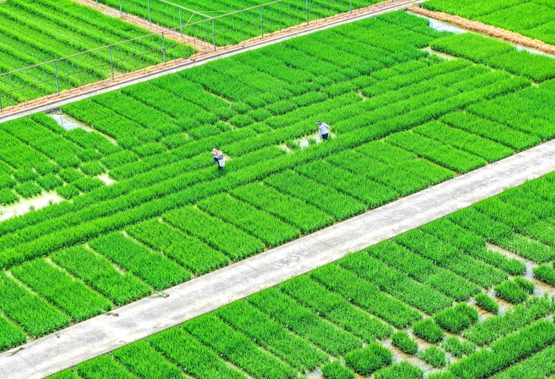 7月7日,在江蘇里下河地區(qū)農(nóng)科所(揚州市農(nóng)科院),農(nóng)民在試驗田勞作(無人機(jī)照片)。