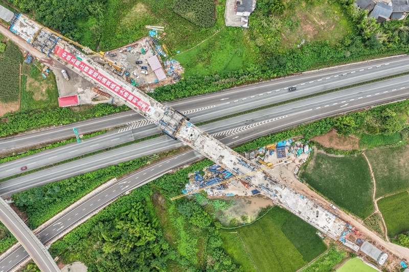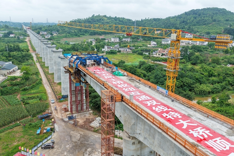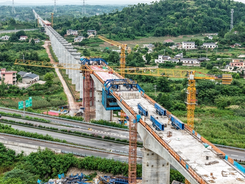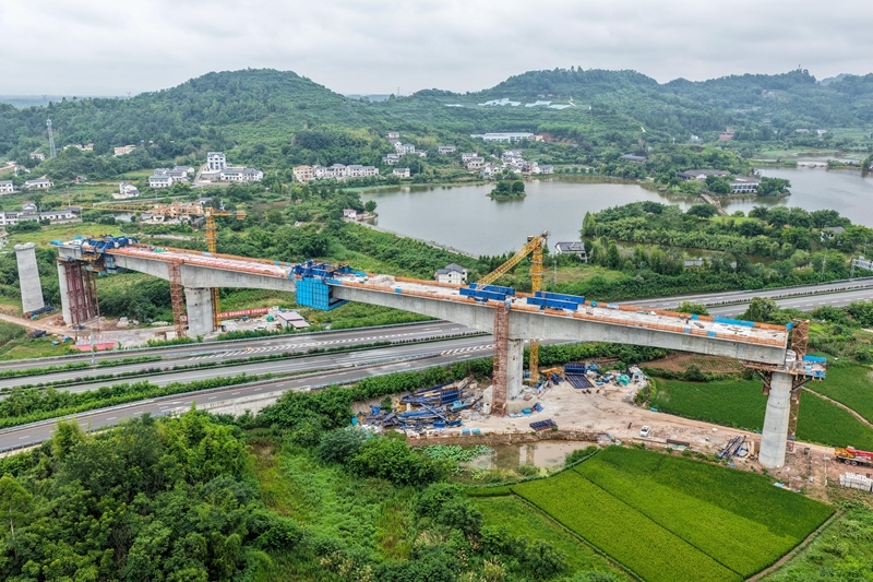 這是7月8日拍攝的成渝中線高鐵土橋樞紐互通雙線特大橋建設(shè)現(xiàn)場(無人機照片)。