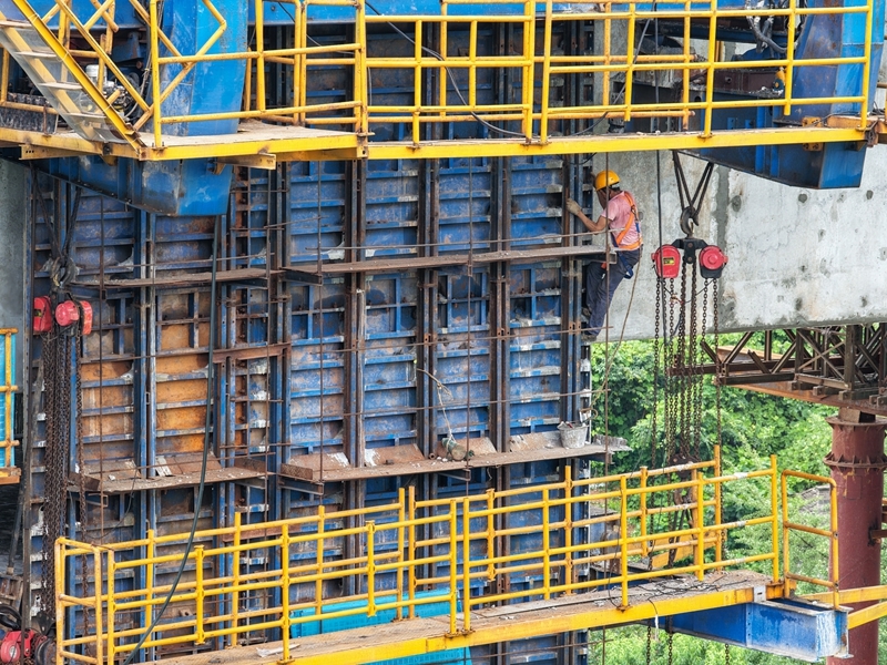 7月8日,工人在成渝中線高鐵土橋樞紐互通雙線特大橋建設(shè)現(xiàn)場施工作業(yè)(無人機照片)。
