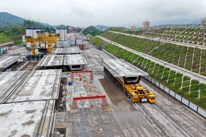 7月10日,在西渝高鐵陳家溝特大橋附近的制梁場,運梁機在進行箱梁轉(zhuǎn)運作業(yè)。