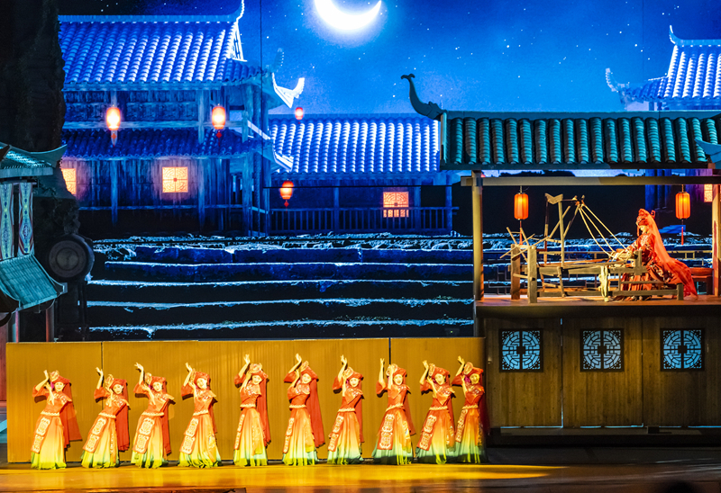 7月10日,游客在利川市騰龍洞的洞穴內觀看實景劇《夷水麗川》。