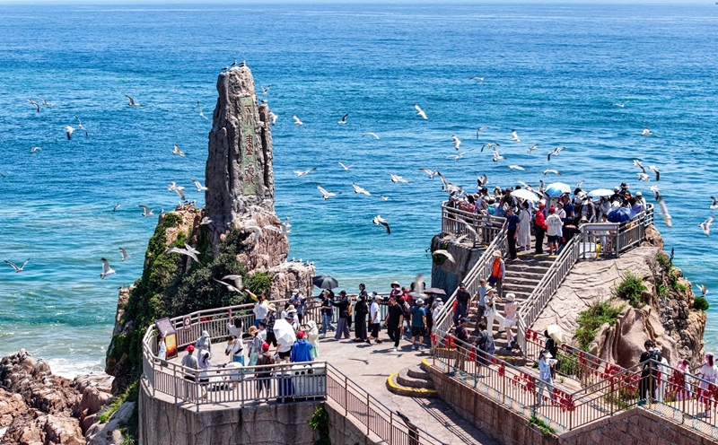 7月12日,山東省榮成市成山頭風(fēng)景區(qū),游客與黑尾鷗互動(dòng)(無人機(jī)照片)。