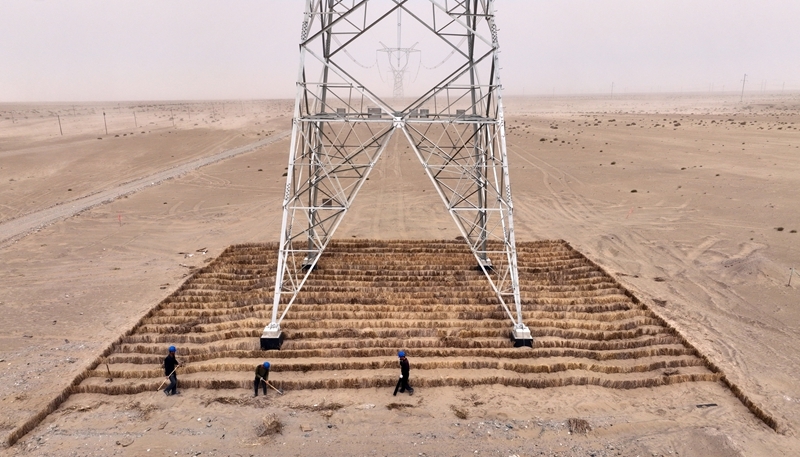 新疆和田地區(qū)于田縣,施工人員在線路塔基下鋪設(shè)草方格(4月24日攝)。