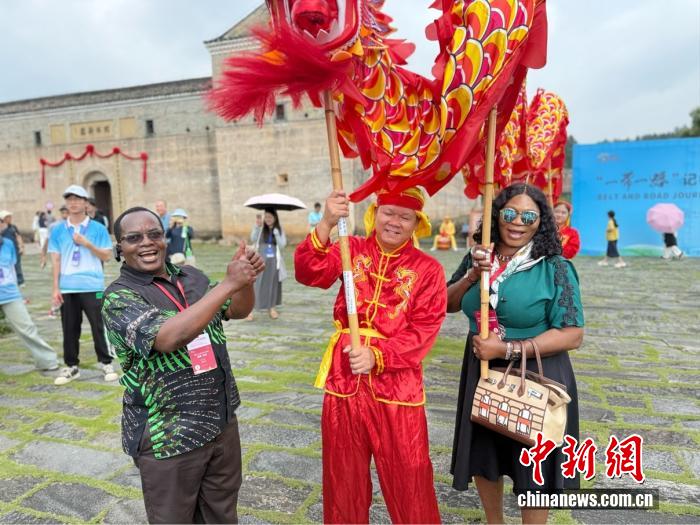 中新網(wǎng)7月21日電(記者 黃方) 鼓聲“咚咚咚”在江西贛州龍南市關(guān)西新圍響起,非洲記者大會(huì)秘書(shū)長(zhǎng)威廉·奧洛首次嘗試舞龍。他興奮地?fù)u動(dòng)著龍頭,跟隨節(jié)奏躍動(dòng),忍不住連聲贊嘆:“這太有節(jié)奏感了!”