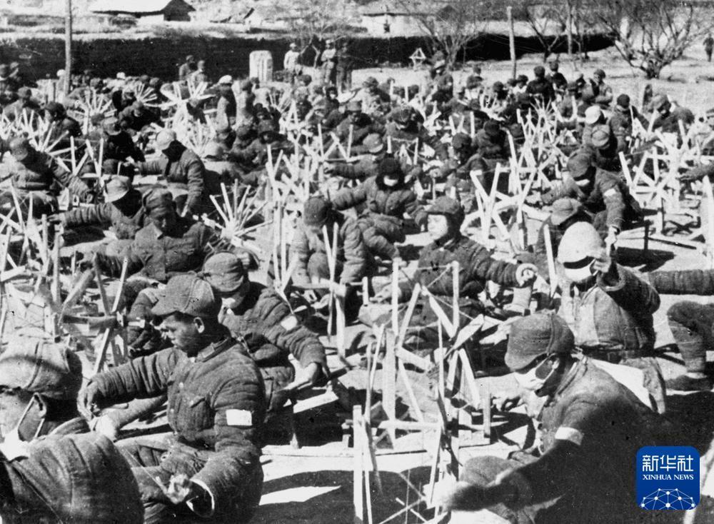 八路軍戰(zhàn)士坐在紡紗車前紡紗。新華社發(fā)