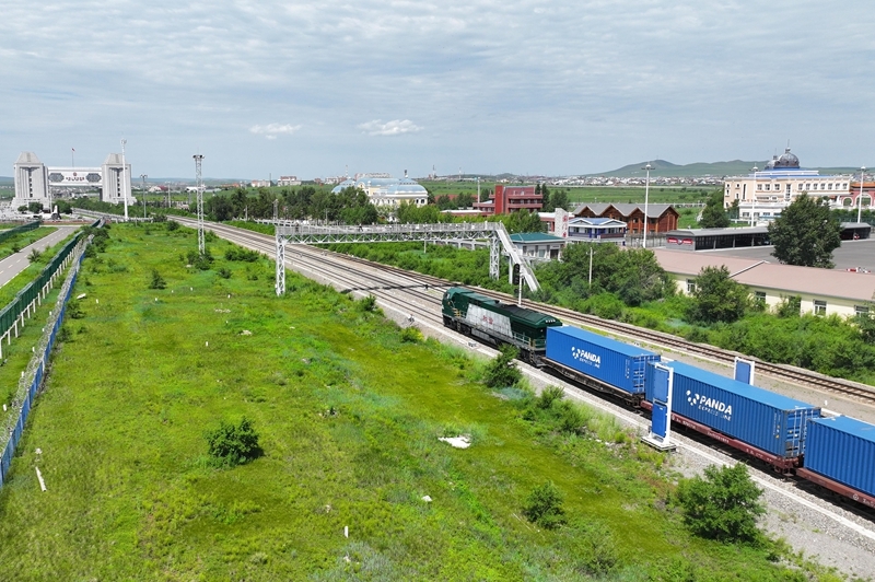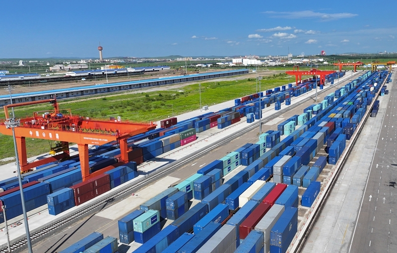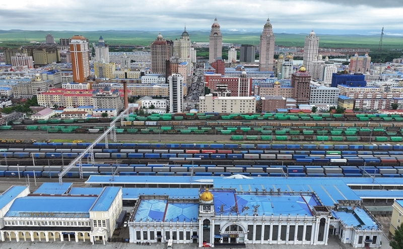 7月24日,一列滿載貨物的中歐班列從中國鐵路哈爾濱局集團(tuán)有限公司滿洲里站駛出國門(無人機(jī)照片)。