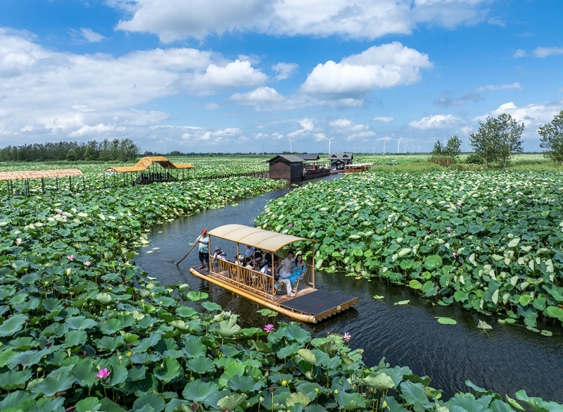 7月26日,游客在江蘇省興化市萬(wàn)畝荷塘景區(qū)賞荷游玩(無(wú)人機(jī)照片)。