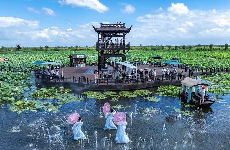 7月26日,游客在江蘇省興化市萬(wàn)畝荷塘景區(qū)觀看表演(無(wú)人機(jī)照片)。
