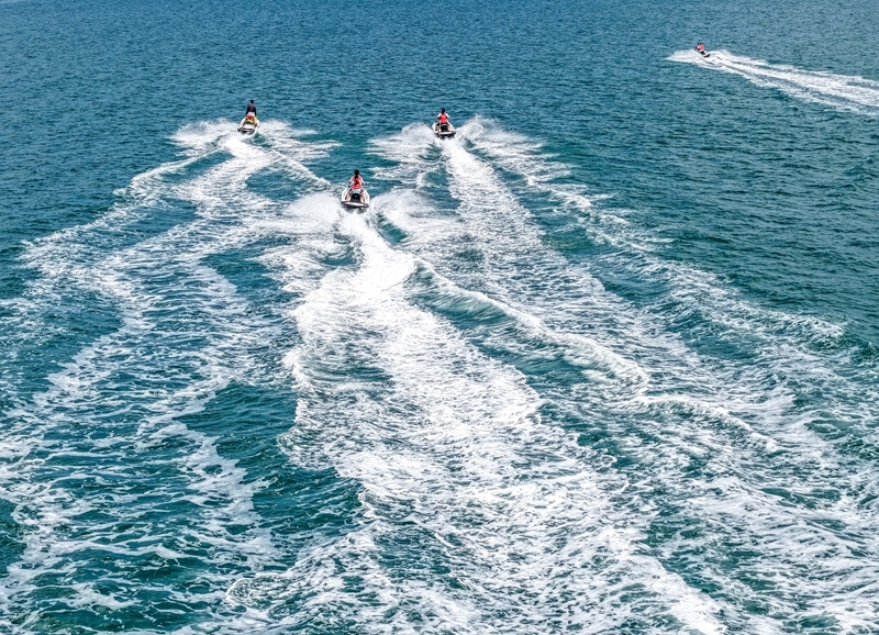 7月24日,游客在山東省榮成市那香海國(guó)際旅游度假區(qū)體驗(yàn)“水上飛人”(無(wú)人機(jī)照片)。