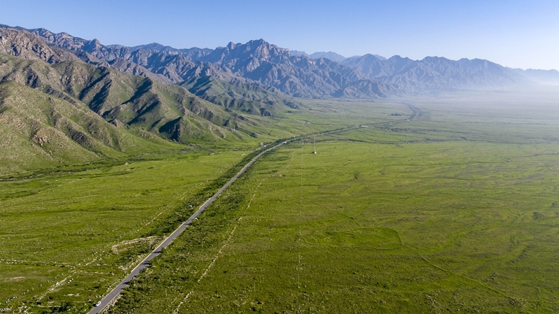 賀蘭山下的戈壁灘草木茂盛(7月29日攝,無人機(jī)照片)。