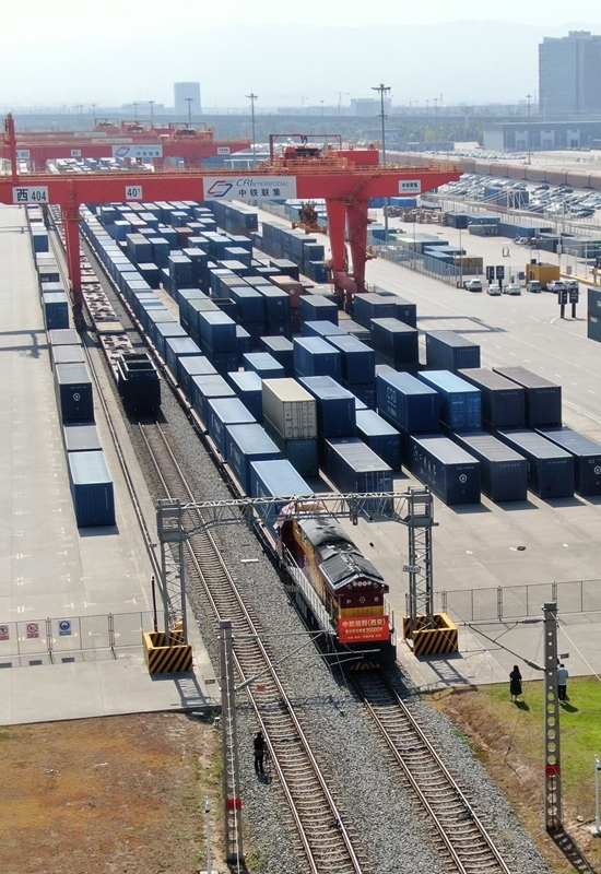 8月13日,X9043次中歐班列準(zhǔn)備從西安國(guó)際港站駛出開往阿塞拜疆巴庫(kù)。