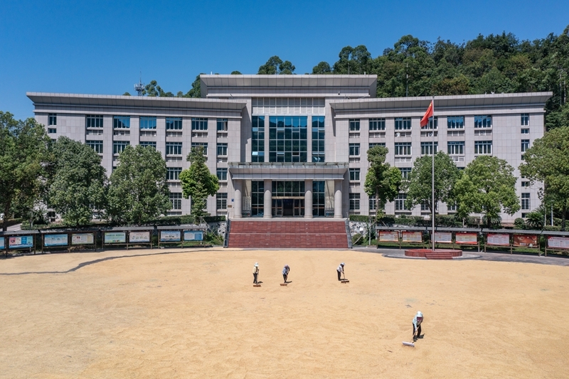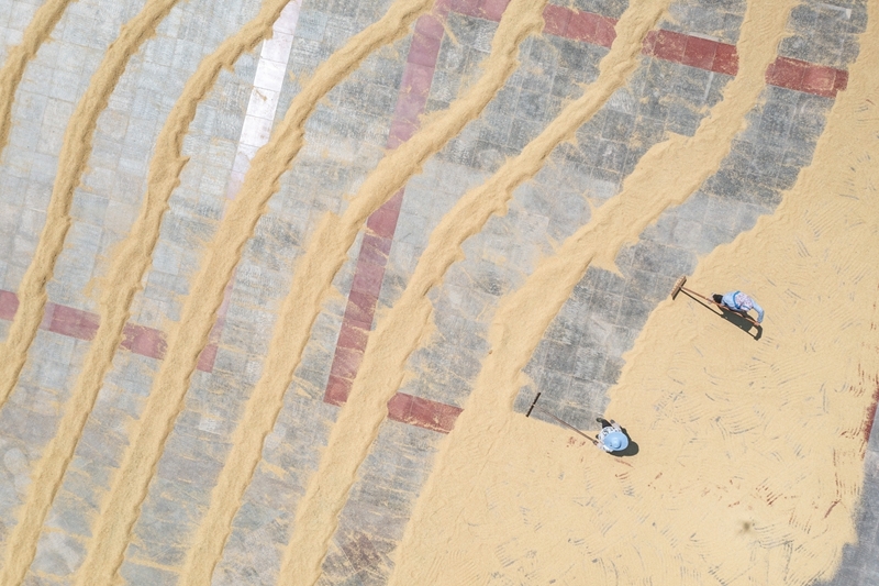 8月20日,人們在重慶市永川區(qū)紅爐鎮(zhèn)政府廣場上晾曬糧食。