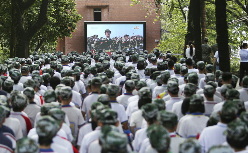 9月3日,廣東省鶴山市第一中學(xué)的師生在觀看紀(jì)念中國人民抗日戰(zhàn)爭暨世界反法西斯戰(zhàn)爭勝利80周年大會(huì)直播。