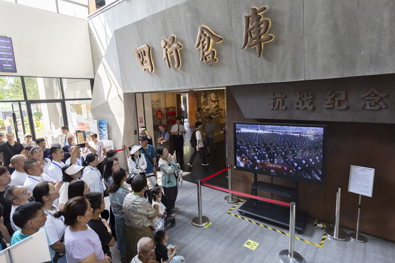 9月3日,市民在上海四行倉庫抗戰(zhàn)紀(jì)念館觀看紀(jì)念中國人民抗日戰(zhàn)爭暨世界反法西斯戰(zhàn)爭勝利80周年大會(huì)直播。
