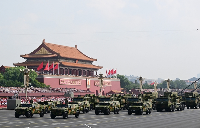 9月3日,紀(jì)念中國人民抗日戰(zhàn)爭(zhēng)暨世界反法西斯戰(zhàn)爭(zhēng)勝利80周年大會(huì)在北京隆重舉行。這是遠(yuǎn)程火炮方隊(duì)接受檢閱。