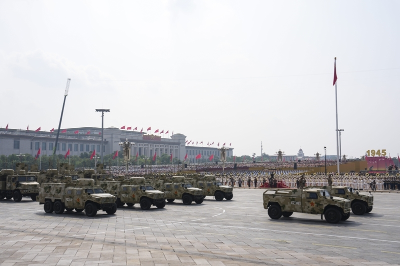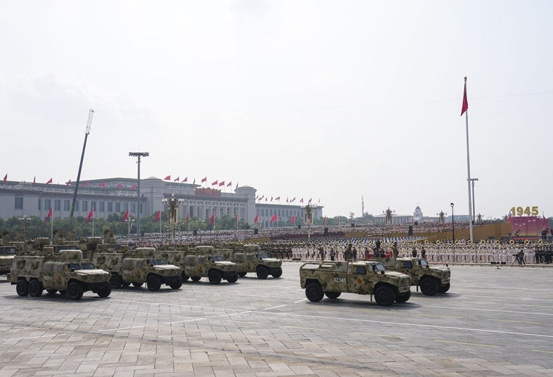 9月3日,紀(jì)念中國人民抗日戰(zhàn)爭(zhēng)暨世界反法西斯戰(zhàn)爭(zhēng)勝利80周年大會(huì)在北京隆重舉行。這是裝備保障方隊(duì)接受檢閱。