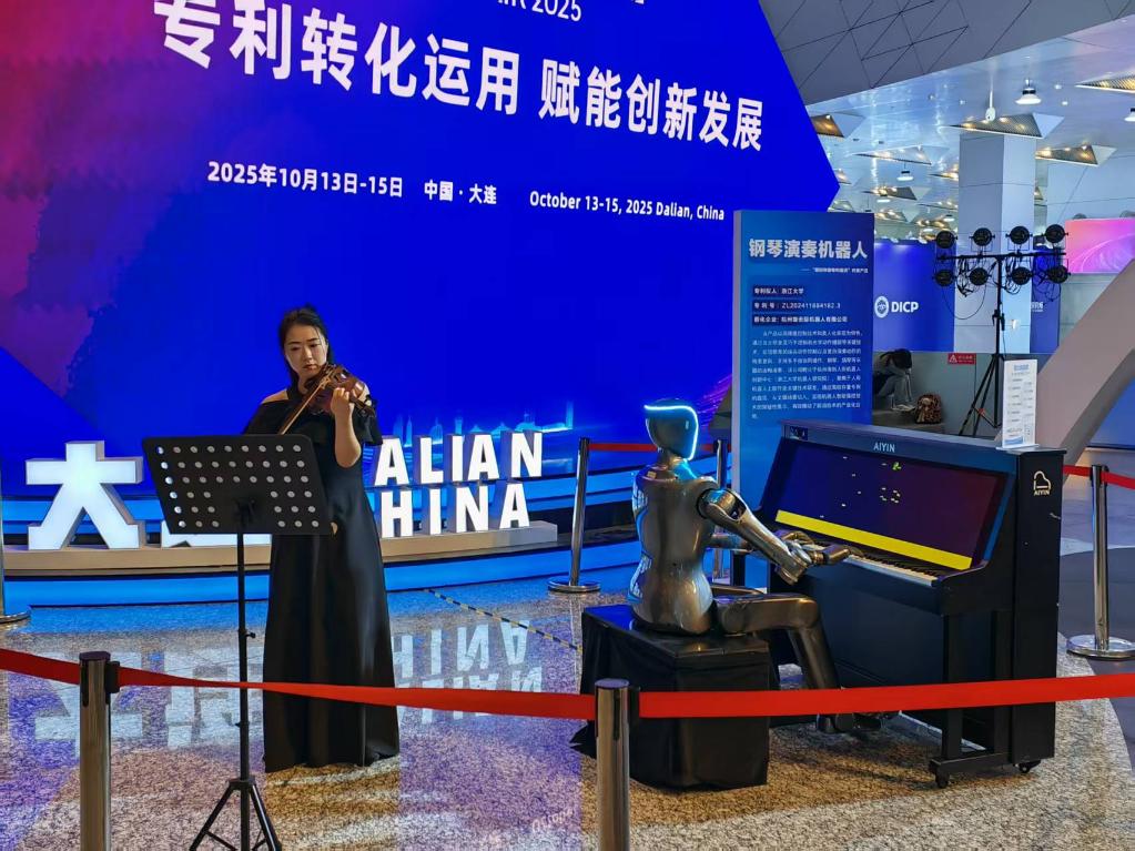走進(jìn)一樓的展示大廳,一段優(yōu)美的音樂旋律緩緩流入耳中,一臺人形機(jī)器人指尖輕快地在鋼琴鍵盤上飛舞,和一名小提琴演奏家共同奏響《我和我的祖國》,引來許多與會嘉賓駐足聆聽。
