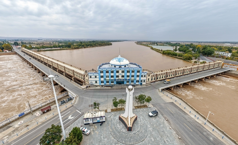 這是10月16日在內(nèi)蒙古巴彥淖爾市磴口縣拍攝的開(kāi)閘放水的三盛公水利樞紐(無(wú)人機(jī)照片)。