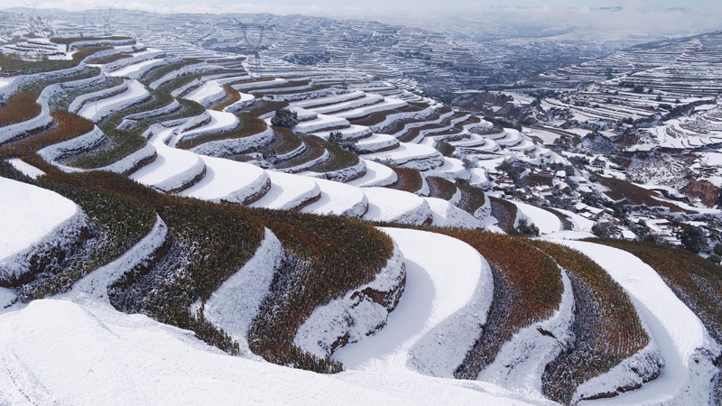 這是10月17日在甘肅永靖縣陳井鎮(zhèn)拍攝的雪后梯田(無(wú)人機(jī)照片)。